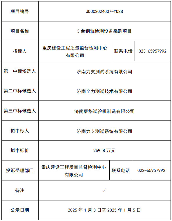 您当前的位置:首页 > 新闻资讯 > 信息公示 重庆建设工程质量监督检测中心有限公司3台钢轨检测设备采购项目中标候选人公示 文章来源: | 发布时间:2025-01-03 09:00:00 | 点击率: 上一篇:重庆建设工程质量监督检测中心有限公司轨道交通杂散电流检测设备采购项目比选邀请公告 下一篇: 重庆建设工程质量监督检测中心有限公司 3台钢轨检测设备采购项目招标公告