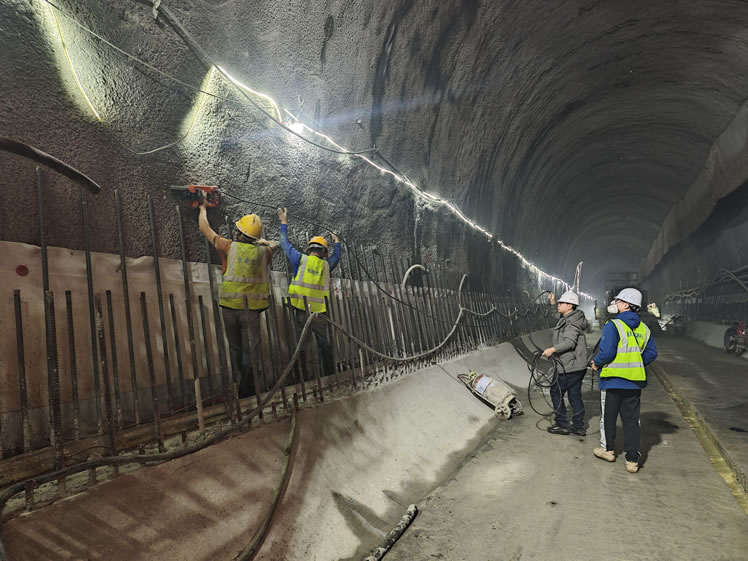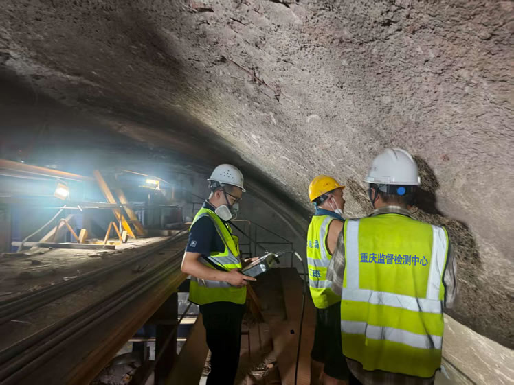 中心主要承担轨道27号线璧山站至磁器口站区段的工程质量检测任务,其中对中梁山隧道的检测涵盖多项关键内容:包括建筑材料、锚杆拉拔力、衬砌厚度、衬砌及背后密实状况、锚杆锚固密实度、衬砌混凝土强度及保护层厚度等检测。为确保项目如期贯通,中心统筹调配人员、设备资源,组建专业技术团队,制定周密检测方案。工作中聚焦隧道衬砌结构质量检测核心环节,高效推进各项检测任务,以及时响应、精准可靠的数据,为施工质量筑牢保障防线。