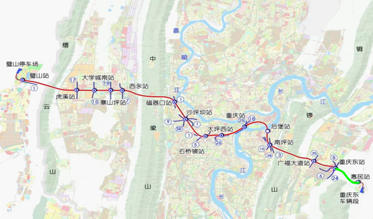 轨道27号线以快线形式串联起重庆东站、重庆站、沙坪坝站三个铁路客运站,全线15座车站中,有换乘站点13座。中梁山隧道工程作为轨道27号线的关键节点工程,全长4.33公里,隧道地质复杂,穿越断层、岩溶、瓦斯、富水区四重叠加带,突涌水风险极高,施工安全风险和难度极大。